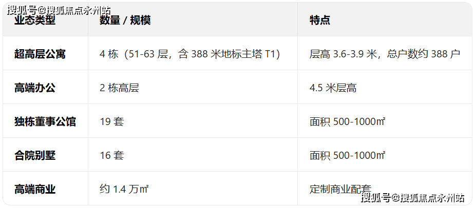 超高层公寓:4栋51-63层超高层,含388米地标从塔T1,总户数约300户,层高3。6-3。9米,远超通俗豪宅尺度。