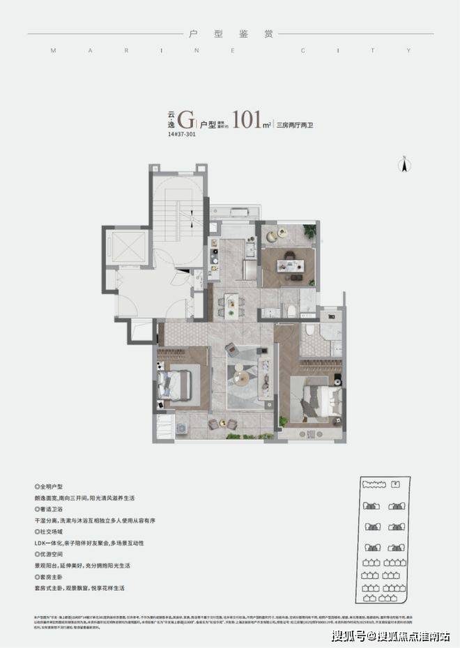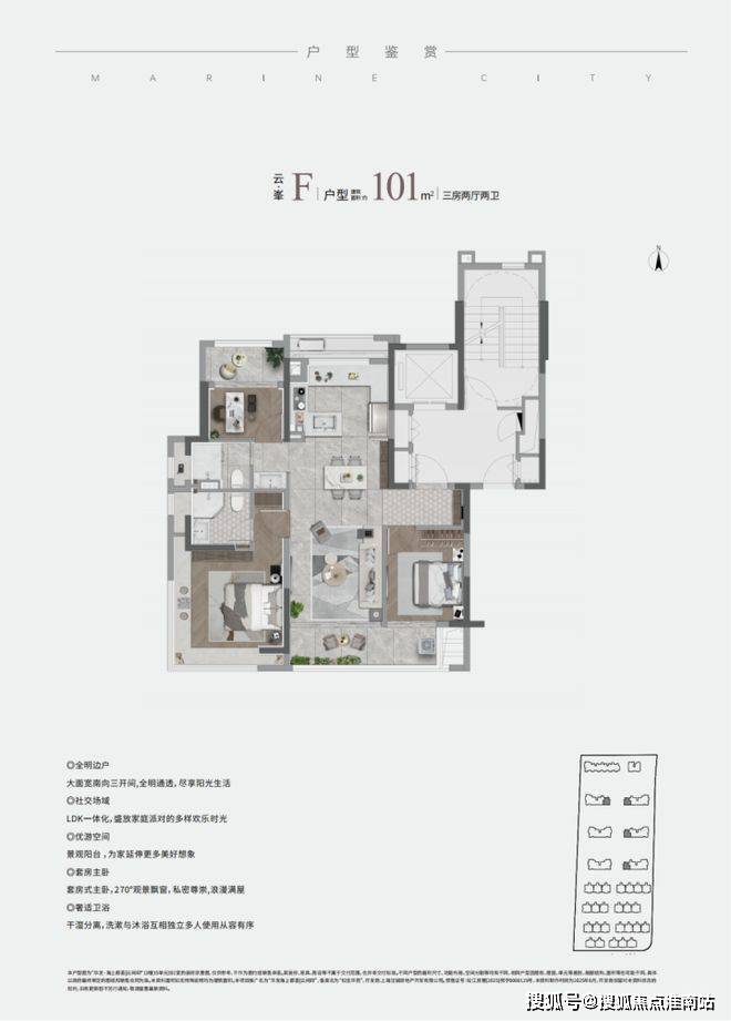 三开间朝南、南北通透、客餐厅厨一体化、南北双背景不雅阳台、U字型厨房、大标准不雅景阳台、全卧室飘窗、从卧套房设想。。。。。营制的空间感和标准感远超同价位其他竞品!