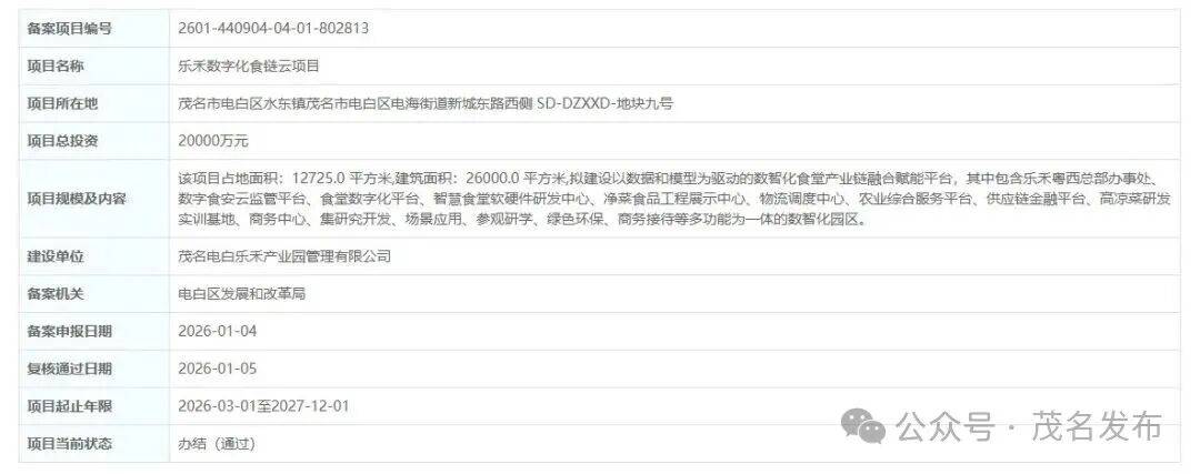 项目规模及内容:该项目占地面积:12725。0 平方米,建建面积:26000。0 平方米,拟扶植以数据和模子为驱动的数智化食堂财产链融合赋能平台,此中包含乐禾粤西总部处事处、数字食安云监管平台、食堂数字化平台、聪慧食堂软硬件研发核心、净菜食物工程展现核心、物流安排核心、农业分析办事平台、供应链金融平台、高凉菜研发实训、商务核心、集研究开辟、场景使用、参不雅研学、绿色环保、商务欢迎等多功能为一体的数智化园区。